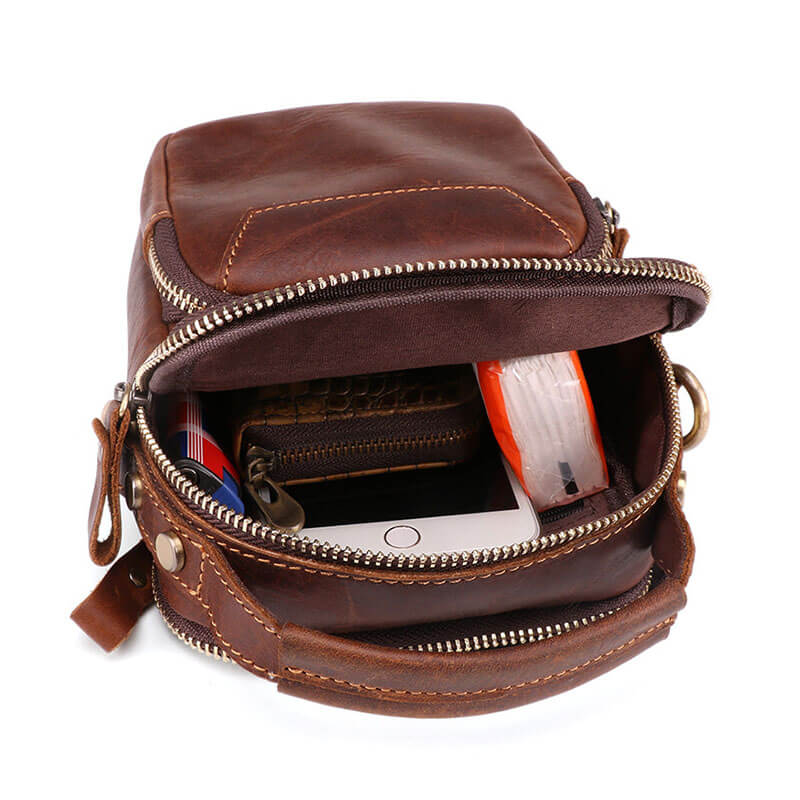 This brown leather sling bag has a deep, rich color that gives a natural and classy look. The bag features strong zippers, an easy-carry handle, and a smart front pocket for quick access. Its design makes it easy to carry small things like your phone, wallet, passport, and keys. Made specially for men, this genuine leather sling bag for men gives you a smart look while keeping your hands free. The strap is adjustable, so you can set it to your comfort easily.
