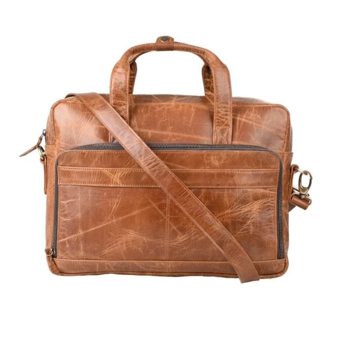 The Jared Leather Laptop Messenger Bag. The full-grain leather used to make the bag matures well, gaining character and individuality with time. It is a stylish leather laptop messenger bag that may be used as a portfolio bag in addition to being a useful accessory. Long trips or commutes will be comfortable thanks to the adjustable shoulder strap, and carrying is made simple with the strong leather handle.