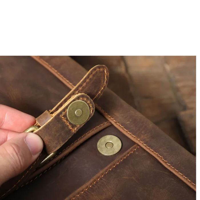 I’ve been using this bag for a month now, and it’s truly fantastic. The distressed brown leather looks even better in person, developing a rich patina with every use. The brass hardware is sturdy, not flimsy at all, which is a major plus for durability. It easily fits my laptop, a notebook, and my Kindle without feeling overly bulky. The adjustable strap is comfortable for long commutes, and the magnetic snap closure is strong enough to keep everything secure. This messenger bag perfectly blends classic style with modern functionality—a worthy investment for anyone who travels a lot for work. Highly recommended!